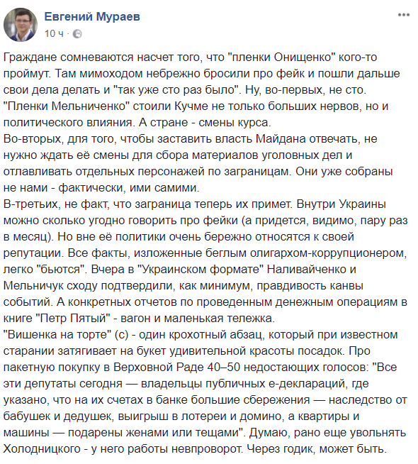 "Граждане (украинские власти - ред.) сомневаются насчет того, что "пленки Онищенко" кого-то проймут. Там мимоходом небрежно бросили про фейк и пошли дальше свои дела делать и "так уже сто раз было". Ну, во-первых, не сто. "Пленки Мельниченко" стоили Кучме не только больших нервов, но и политического влияния.