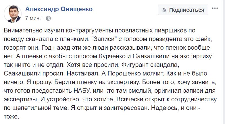"Внимательно изучил контраргументы провластных пиарщиков по поводу скандала с пленками. "Записи" с голосом президента это фейк, говорят они. Год назад эти же люди рассказывали, что пленок вообще нет. А пленки с якобы с голосом Курченко и Саакашвили на экспертизу так никто и не отдал. Хотя все просили. Фигурант скандала, Саакашвили просил. Настаивал. А Порошенко молчит. Как и не было ничего. Я прошу. Берите пленку на экспертизу. Более того, хочу заявить, что готов предоставить НАБУ, или кто там смелый, оригинал записи для экспертизы. И устройство, что хотите. Всячески открыт к сотрудничеству по щепетильной теме", -пишет Онищенко.