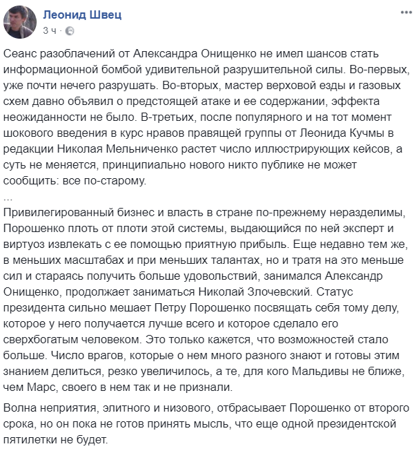 "Сеанс разоблачений от Александра Онищенко не имел шансов стать информационной бомбой удивительной разрушительной силы. Во-первых, уже почти нечего разрушать. Во-вторых, мастер верховой езды и газовых схем давно объявил о предстоящей атаке и ее содержании, эффекта неожиданности не было. В-третьих, после популярного и на тот момент шокового введения в курс нравов правящей группы от Леонида Кучмы в редакции Николая Мельниченко растет число иллюстрирующих кейсов, а суть не меняется, принципиально нового никто публике не может сообщить: все по-старому.