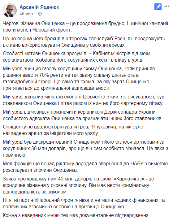 Ни у меня, ни у партии "Народный фронт" никогда не было никаких финансовых и политических отношений с лицом по фамилии Онищенко. Каждый из приведенных мной тезисов имеет документальное подтверждение".