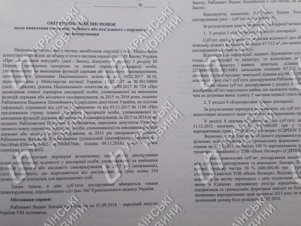 В сообщении НАПК говорится, что в действиях Рабиновича выявлены признаки состава правонарушения, ответственность за которое предусмотрена ст. 366-1 (декларирование недостоверной информации) Уголовного кодекса. Данные о правонарушении НАПК передаст в Национальное антикоррупционное бюро в пятницу.