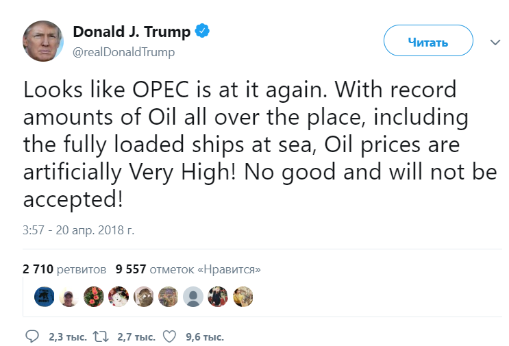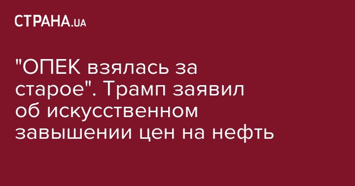 "Похоже, ОПЕК взялась за старое. С учетом рекордных объемов Нефти повсюду, включая полностью загруженные суда на море. Нефтяные цены искусственно завышены и очень сильно! Нехорошо и неприемлемо!", - написал с соцсети Трамп.