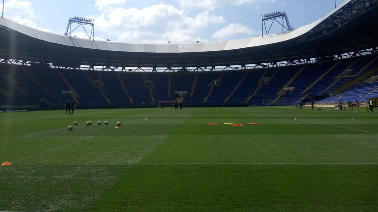 Футболисты начали выходить на поле около 11:15. Собравшиеся на стадионе болельщики встречали каждого игрока аплодисментами.