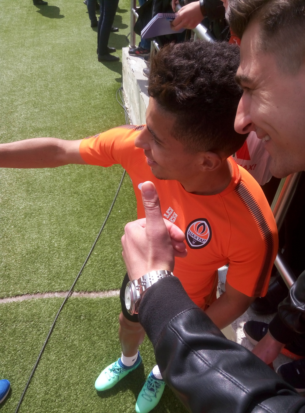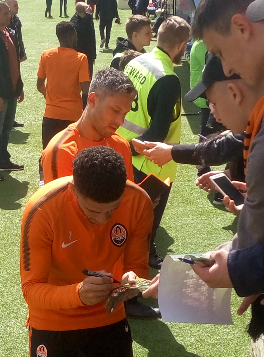 Проведя завершающий тренировку спарринг футболисты "Шахтера" направились к фанатам, с удовольствием подписывая как клубную атрибутику, так и простые тетради. Не отказывались футболисты и от дружеских selfie.