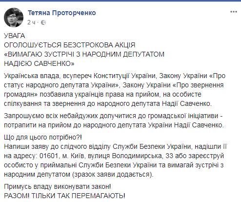 Проторченко также выложила образец заявления и текст своего ходатайства о встрече с Савченко.