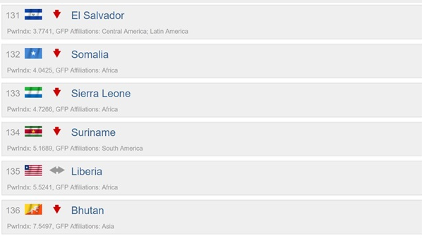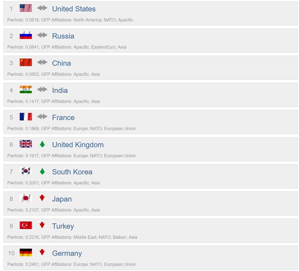 По мнению составителей рейтинга, совокупная военная мощь Украины стоит между Грецией и Чехией. Пятерку сильнейших государств мира возглавили США. За ними следуют вооруженные силы России, Китая, Индии и Франции.