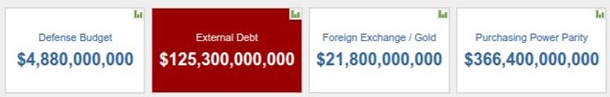 Еще одно больное место каждой Украины - это размер внешнего государственного долга, который по данным Global Firepower, составил 125,3 миллиарда долларов, что на 2,4 миллиарда меньше, чем в прошлогоднем рейтинге.