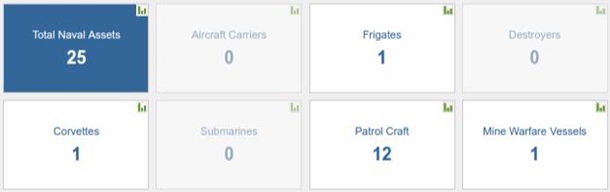 Авианосцев, эсминцев и субмарин у Украины ноль единиц; фрегатов, корветов и тральщиков - по одному. Также есть 12 патрульных катеров.