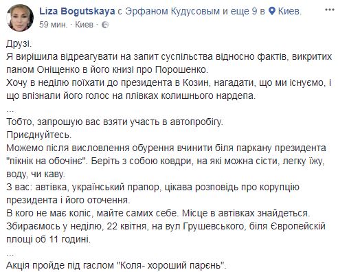 Активисты, после обнародованных нардепом Онищенко пленок, собираются устроить пробег к президенту Петру Порошенко в Козин, где он живет. Об этом пишет одна из участниц будущего пробега к имениям президента на своей странице в Facebook.