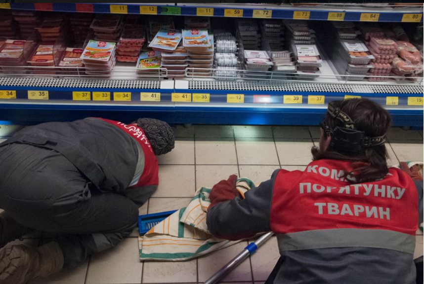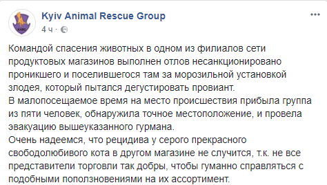 Команда спасения животных в одном из продуктовых магазинов Киева поймала кота, который проник в помещение и спрятался за морозильной установкой.