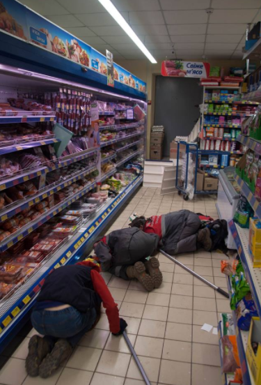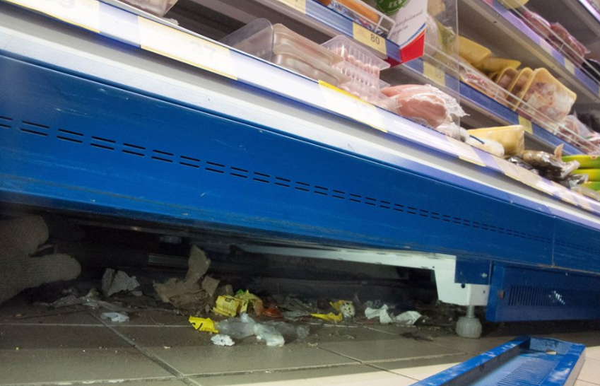 Судя по оберткам под холодильником, кот успел полакомиться продуктами, а затем так далеко забился за морозилку с сосисками, что сотрудники магазина не смогли самостоятельно его достать.