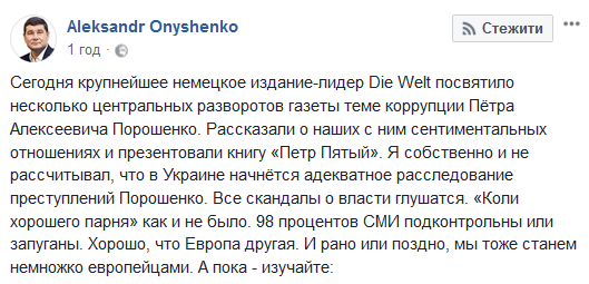 "Рассказали о наших с ним сентиментальных отношениях и презентовали книгу "Петр Пятый". Я собственно и не рассчитывал, что в Украине начнется адекватное расследование преступлений Порошенко. Все скандалы о власти глушатся. "Коли – хорошего парня" как и не было. 98 процентов СМИ подконтрольны или запуганы. Хорошо, что Европа другая. И рано или поздно, мы тоже станем немножко европейцами. А пока – изучайте", – написал Онищенко и выложил скриншоты газетных полос.