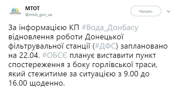 В министерстве добавили что, по информации КП "Вода Донбасса", возобновление работы ДФС запланировано на 22 апреля.