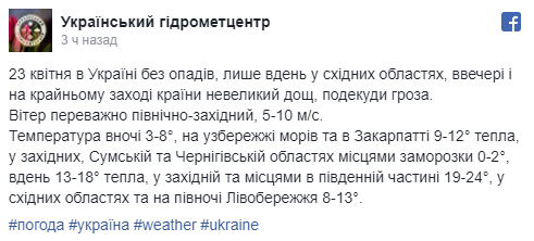 "23 апреля в Украине без осадков, лишь днем в восточных областях, вечером и на крайнем западе страны небольшой дождь, местами гроза. Ветер преимущественно северо-западный, 5-10 метров в секунду", - говорится в сообщении.