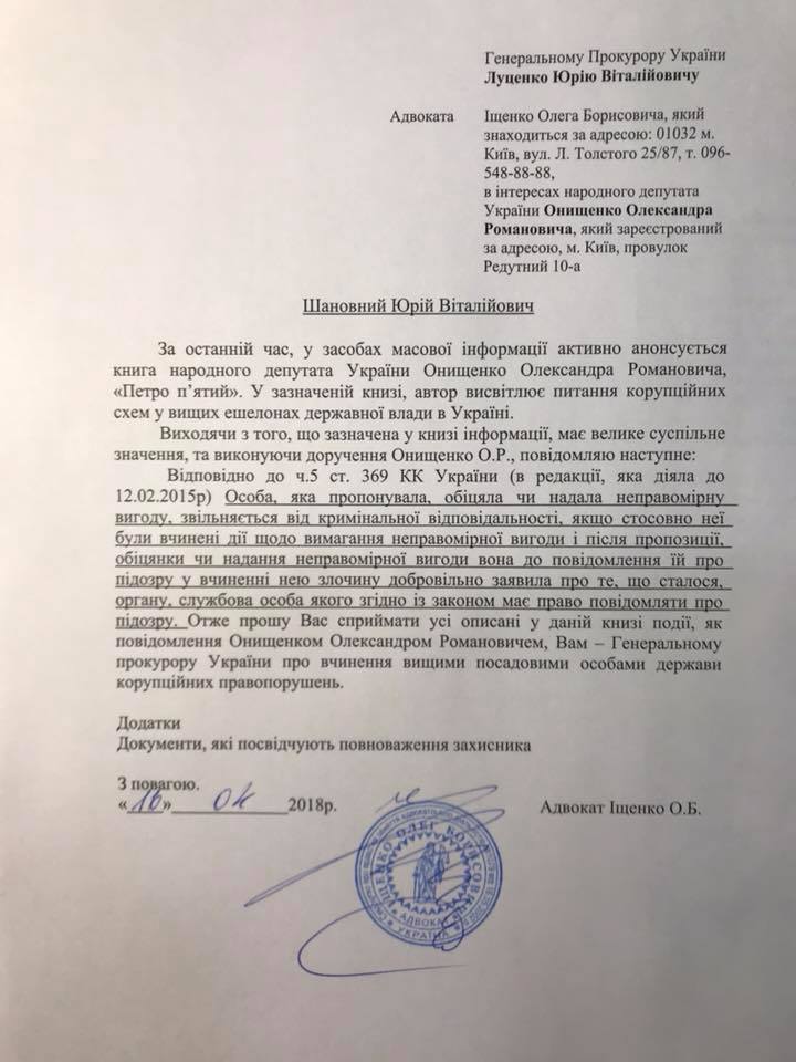 "С этой целью мною, как адвокатом Онищенко А.Р., еще 16 апреля 2018г. на имя Генерального прокурора Украины было направлено соответствующего сообщения (копия прилагается). Учитывая то, что данное сообщение было направлено до появления первых публикаций сведений об указанных фактах, Онищенко АР не может нести за них уголовную ответственность", - пишет Ищенко.