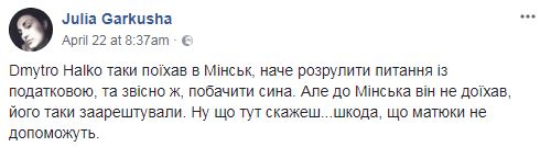 "Дмитрий Галко таки поехал в Минск, вроде как разрулить вопрос с налоговой, и конечно же, увидеть сына. Но в Минск он не доехал, его же арестовали", - написала она.