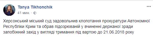 "Херсонский городской суд удовлетворил ходатайство прокуратуры Автономной Республики Крым и выбрал подозреваемой в совершении государственной измены меру пресечения в виде содержания под стражей до 21.06.2018 года", - написала пресс-секретарь.