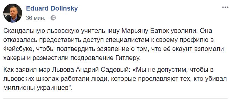 "Скандальную львовскую учительницу Марьяну Батюк уволили. Она отказалась предоставить доступ специалистам к своему профилю в Фейсбуке, чтобы подтвердить заявление о том, что ее аккаунт взломали хакеры и разместили поздравление Гитлеру", – пишет Долинский.
