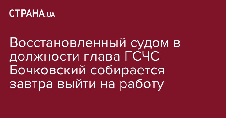 Восстановленный судом в должности главы Государственной службы Украины по чрезвычайным ситуациям Украины Сергей Бочковский утром в пятницу, 27 апреля, намерен выйти на работу, сообщил его адвокат Игорь Федоренко.