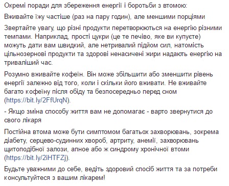 Ульяна Супрун в Facebook уверяет, что ее советы помогут сохранять больше энергии на все полезные дела.
