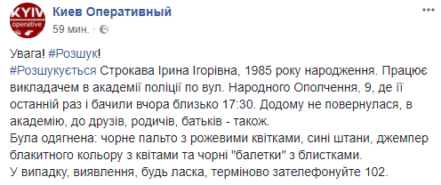 "Разыскивается Строкава Ирина Игоревна, 1985 года рождения. Работает преподавателем в академии полиции по ул. Народного Ополчения, 9, где ее последний раз и видели вчера около 17:30. Домой не вернулась, в академию, к друзьям, родственникам, родителям – тоже", – говорится в сообщении.