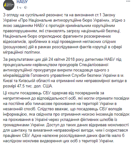 Уточняется, что по результатам следственных действий детективов НАБУ, сотрудник СБУ был задержан 24 апреля 2018 года во время получения взятки в размере 47,5 тыс. долларов.