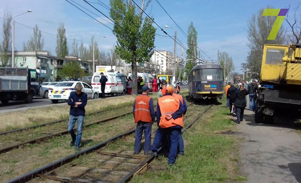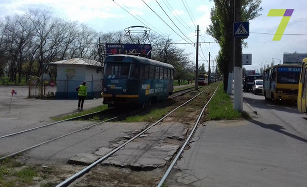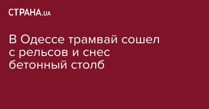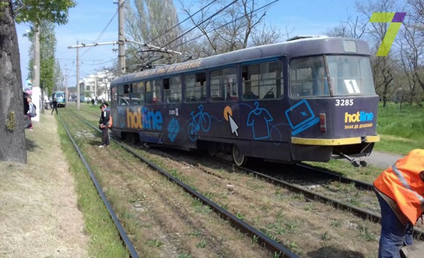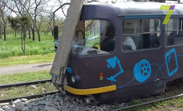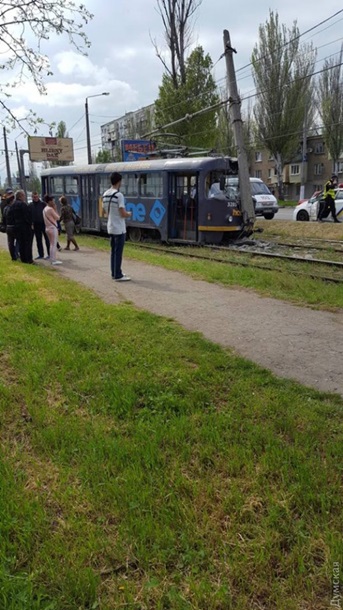 В Одессе трамвай маршрута №1 наехал на камень, находившийся на полотне, и сошел с рельсов. Затем трамвайный вагон врезался в столб.