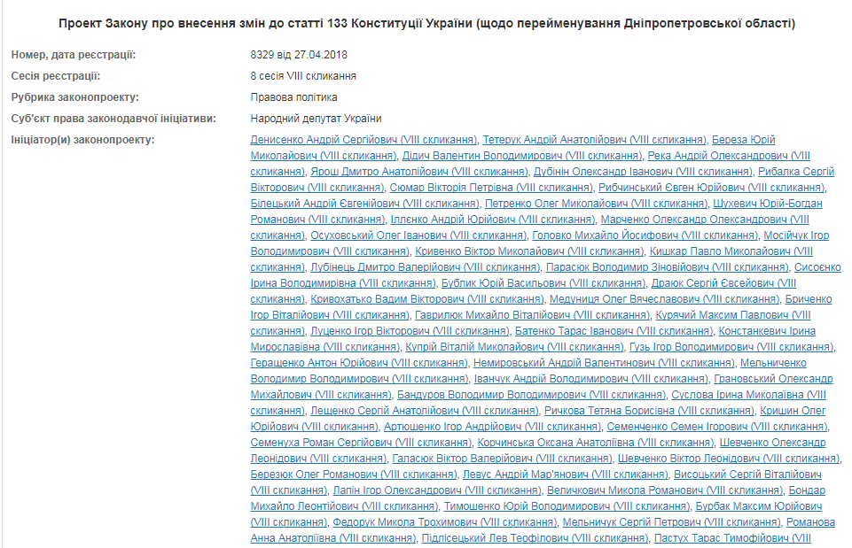 Группа народных депутатов Украины подала в Раду законопроект №8329 о внесении изменений в ст.133 Конституции Украины - переименовании Днепропетровской области.