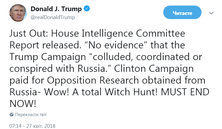 "Только что: опубликован отчет Комитета палаты представителей Конгресса США по разведке. "Нет доказательств" того, что штаб Трампа "вступил в сговор, координацию или заговор с Россией". Кампания (имеется ввиду избирательная кампания Хиллари - Прим.Ред.) Клинтон заплатила за "оппозиционное исследование", полученное от России. Вау! Абсолютная охота на ведьм! Должна закончиться сейчас", - написал Дональд Трамп.