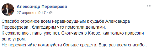 Переверзева забрали в больницу прямо с репетиции, ему стало плохо. Утром 27 апреля его привезли в Киевский кардиоцентр имени Амосова для проведения экстренной операции.