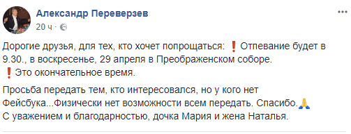 Прощание с музыкантом состоится в воскресенье, 29 апреля в Свято-Преображенском соборе в Днепре.