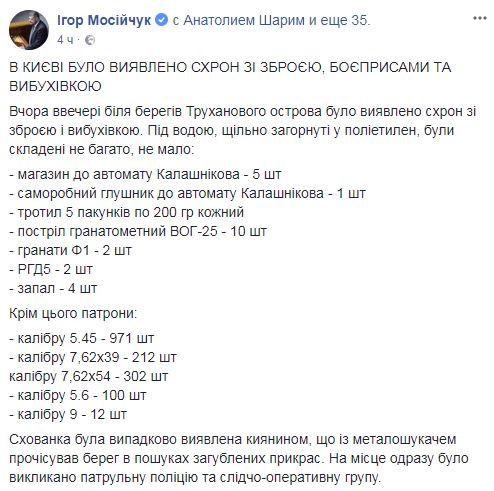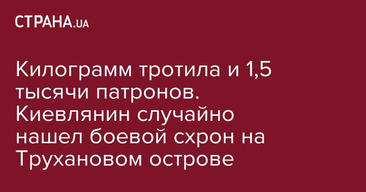 В воскресенье, 29 апреля, на Трухановом острове в Киеве нашли схрон с оружием и боеприпасами. Были обнаружены глушитель к автомату, килограмм тротила, 4 гранаты, 10 зарядов к гранатомету и 1,5 тысячи патронов.