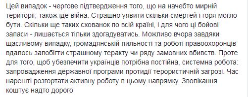 "Под водой, плотно завернутые в полиэтилен, были сложены много, ни мало: магазин к автомату Калашникова – 5 шт, самодельный глушитель к автомату Калашникова – 1 шт, тротил 5 пакетов по 200 грамм каждый, выстрел гранатометный ВОГ-25 – 10 шт , гранаты Ф1 – 2 шт, РГД-5 – 2 шт, запал– 4 шт. Кроме этого – 1,5 тысячи патронов", - сообщил он.
