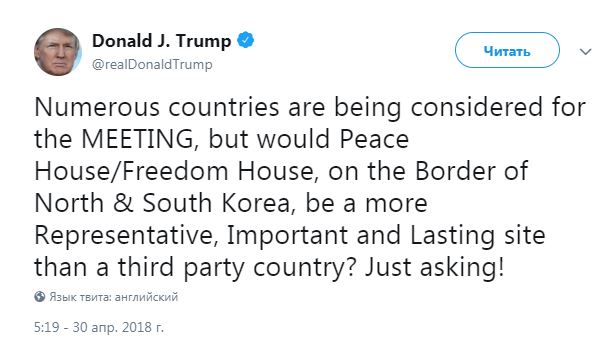 "Многочисленные страны рассматриваются для встречи, но не будет ли Дом мира /Дом свободы на границе Северной и Южной Кореи более представительным, важным и надежным местом, чем территория третьей стороны? Просто задаюсь вопросом!", - написал Трамп.