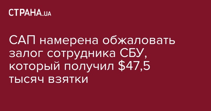 Специализированная антикоррупционная прокуратура намерена обжаловать решение суда, который арестовал подозреваемого в получении 47,5 тыс. долларов взятки сотрудника СБУ и установил залог 1,2 млн гривен.