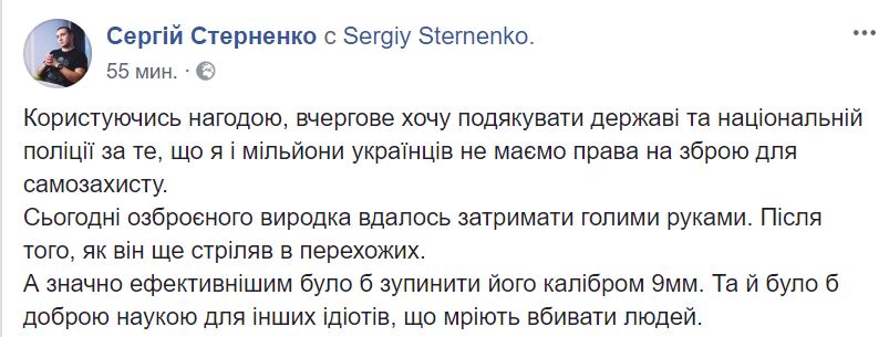 По его словам, нападавший выстрелил ему в область шеи сзади из пистолета, а затем, при задержании, стрелял по очевидцам инцидента. Сам Стерненко, несмотря на ранение, также участвовал в задержании стрелявшего.