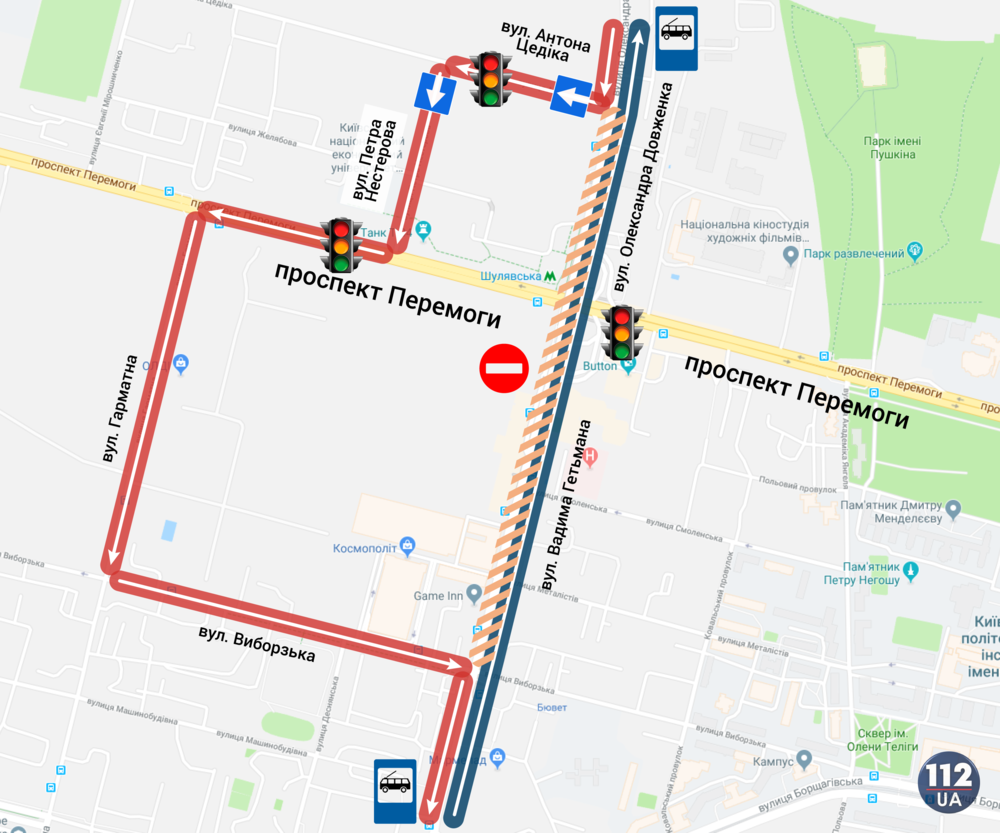- движение по маршруту ул. Александра Довженко – ул. Вадима Гетьмана (в сторону Караваевых дач) будет осуществляться по улицам: Антона Цедика (ул. Эжена Потье), Петра Нестерова с выездом на пр. Победы (на этом участке пр. Победы будет установлен временный светофор), Гарматной, Выборгской и возвращением на ул. Вадима Гетьмана;