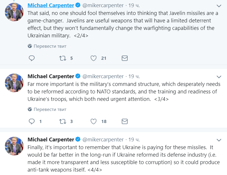 "Они являются полезным видом вооружения, которое будет иметь ограниченный сдерживающий эффект, но не изменит фундаментально возможности украинской армии. Значительно важнее структура командования вооруженных сил, которая отчаянно нуждается в реформировании в соответствии со стандартами НАТО, а также уровень подготовки и боеготовности украинских войск - обе эти составляющие требуют срочной помощи", - отметил Карпентер.