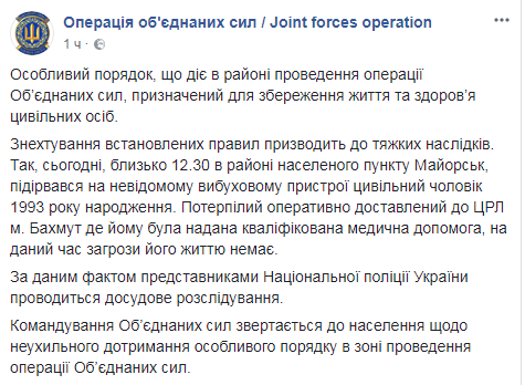 "Пренебрежение установленными правилами приводит к тяжелым последствиям. Так, сегодня, около 12.30 в районе населенного пункта Майорск, подорвался на неизвестном взрывном устройстве гражданский мужчина 1993 года рождения. Пострадавший оперативно доставлен в ЦРБ г. Бахмут, где ему была оказана квалифицированная медицинская помощь, в настоящее время угрозы его жизни нет", - говорится в обнародованном на странице пресс-центра в соцсети Facebook сообщении.