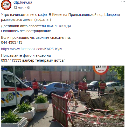 "Утро начинается не с кофе. В Киеве на Предславинской под Шевроле разверзлась земля (асфальт). Доставали авто спасатели КАРС КМДА. Обошлось без пострадавших", - говорится в сообщении в соцсети.