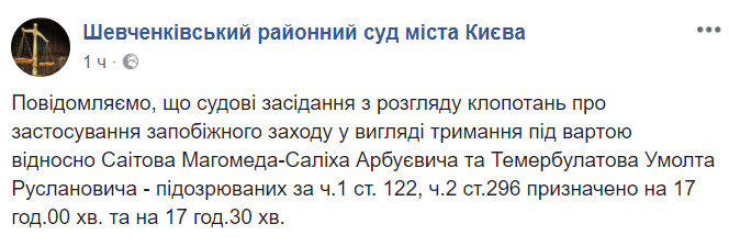 Меру пресечения еще двум фигурантам инцидента будет избирать судья Татьяна Левицкая. Это касается Умала Темербулатова и Магомед-Салиха Саитова.