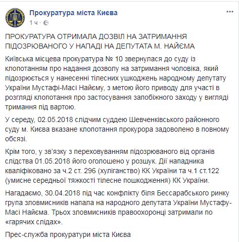 В сообщении говорится, что Киевская местная прокуратура №10 обратилась в суд с ходатайством о предоставлении разрешения на задержание мужчины, который подозревается в нанесении телесных повреждений народному депутату Украины Мустафе-Маси Найему, с целью его привода для участия в рассмотрении ходатайства о применении меры пресечения в виде содержания под стражей.