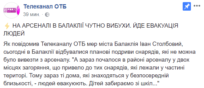 Как сообщил телеканалу ОТБ мэр города Балаклея Иван Столбовой, сегодня в на складах происходили плановые подрывы снарядов, которые нельзя было вывезти из арсенала.