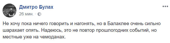 "Не хочу пока ничего говорить и нагонять, но в Балаклее очень сильно шарахает опять. Надеюсь, это не повтор прошлогодних событий, но местные уже на чемоданах", - сообщил также депутат Харьковского облсовета Дмитрий Булах.