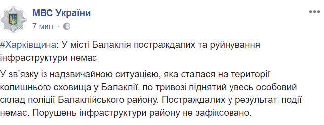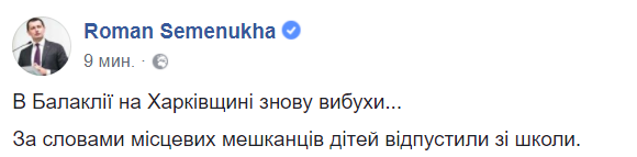 "В Балаклее на Харьковщине снова взрывы. По словам местных жителей, детей отпустили из школы", - написал в Facebook нардеп Роман Семенуха.
