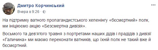 "В поддержку" ватного пропагандистского хэппенинга "Бессмертный полк", мы инициируем акцию "Бессмертная дивизия". Восьмого и девятого мая с портретами наших дедов и прадедов из дивизии "Галичина" мы должны убедить ватников, что их полк не так уж и бессмертен", - написал он.