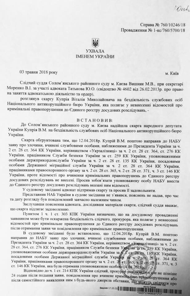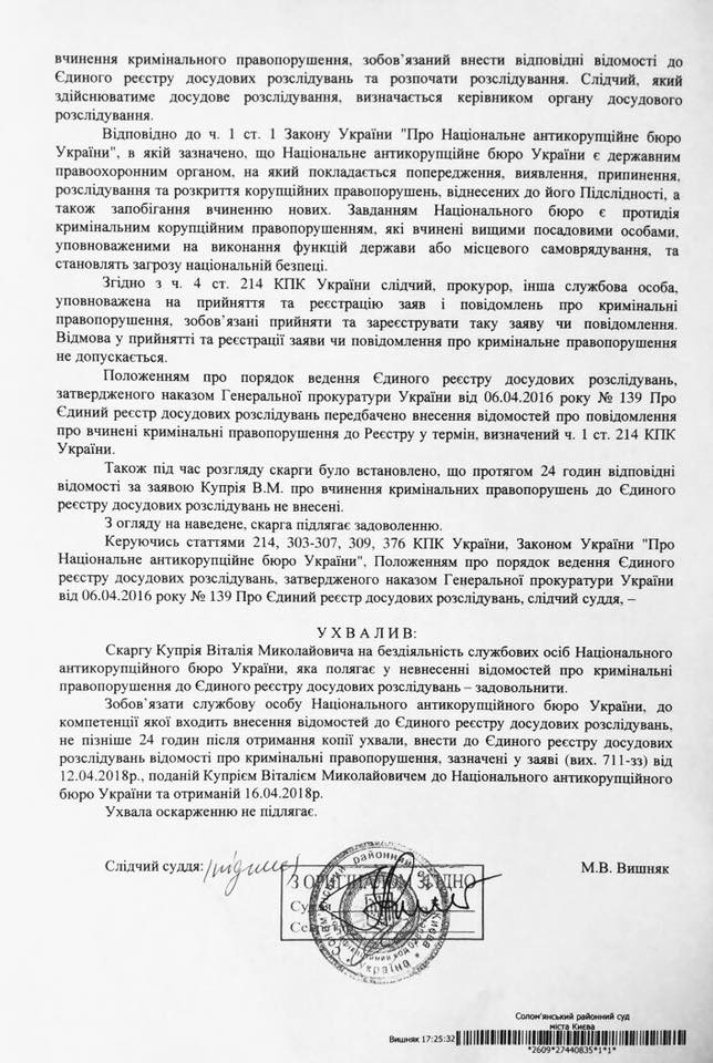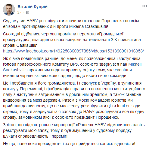 Конечно, подконтрольное корпорации "Рошен" НАБУ отказалось даже регистрировать мое заявление, поэтому я был вынужден в судебном порядке искать справедливость и победил! Ну что, господин пока президент, и за это придется когда-то ответить!", - написал Куприй.