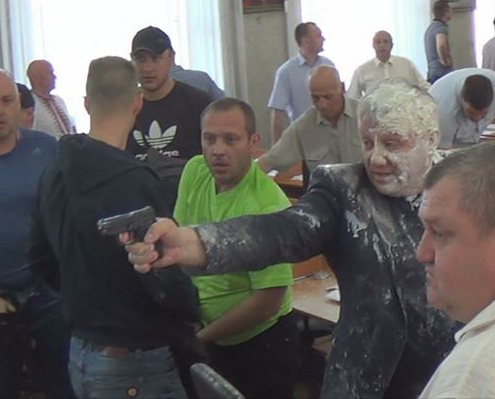 Затем активисты поднялись на трибуну и, по словам очевидцев, надели депутату Александру Рыбакову на голову пакет с кефиром, а мэра Андрея Фисака облили зеленкой. После этого раздались два выстрела. По словам очевидцев, один - в потолок, второй - в сторону активистов. Стрелял из пистолета депутат Рыбаков.