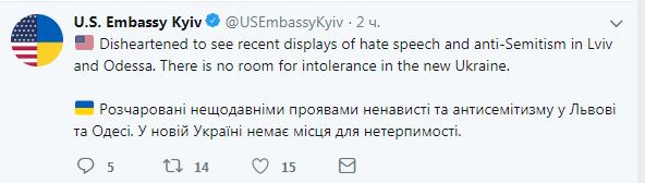 "Разочарованы недавними проявлениями ненависти и антисемитизма во Львове и Одессе. В новой Украине нет места для нетерпимости", - сказано в нем.