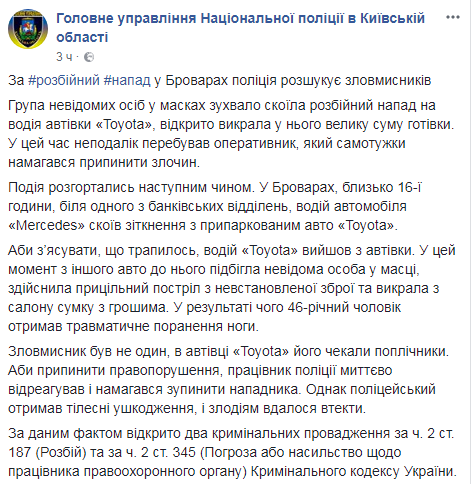 "3 мая,а в Броварах, около 16 часов, возле одного из банковских отделений, водитель автомобиля "Mercedes" столкнулся с припаркованным авто "Toyota". Чтобы выяснить, что случилось, водитель "Toyota" вышел из машины. В этот момент из другого авто к нему подбежал неизвестный в маске, осуществил прицельный выстрел из неустановленного оружия и похитил из салона сумку с деньгами. В результате чего 46-летний мужчина получил травматическое ранение ноги", - говорится в сообщении.